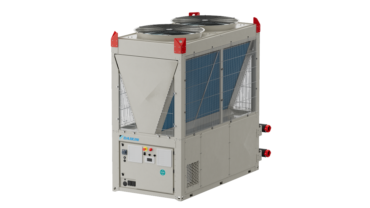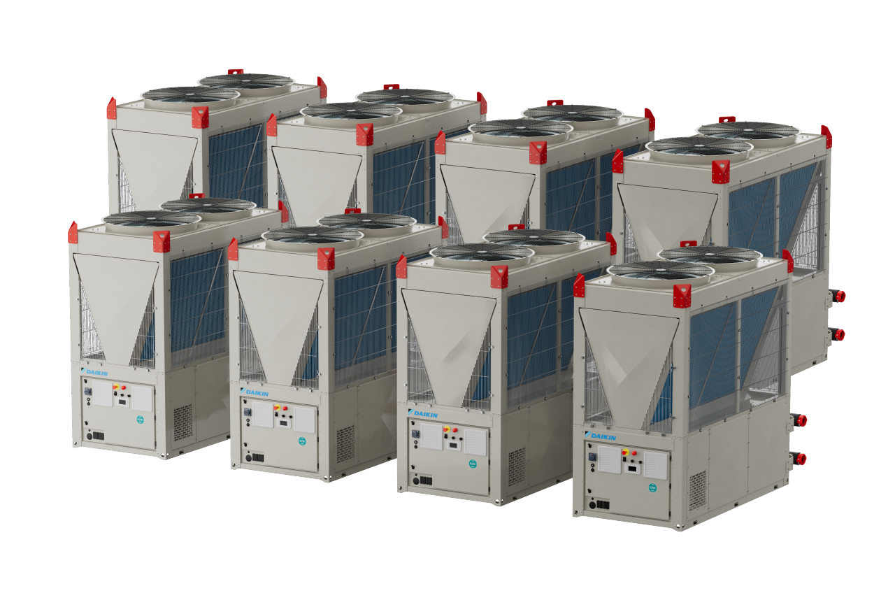 Daikin EWYK-QZ je modularna inverterska dizalica topline zrak-voda koja koristi radnu tvar R-290, projektirana za skaliranje od jednog modula od 135 kW do 2000 kW na više nizova.